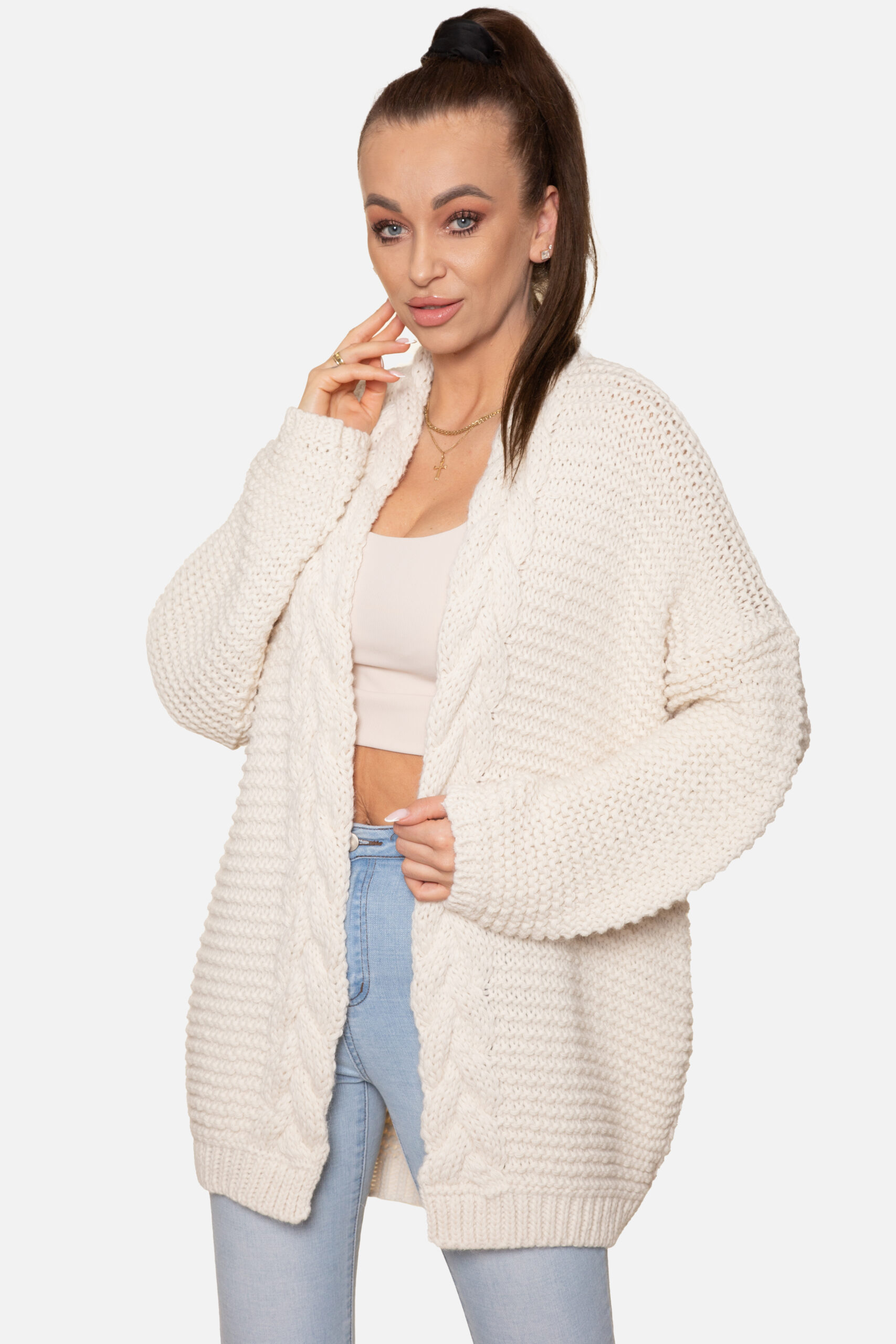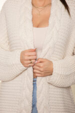 Długi kardigan z ozdobnym splotem, wykończony warkoczem.