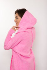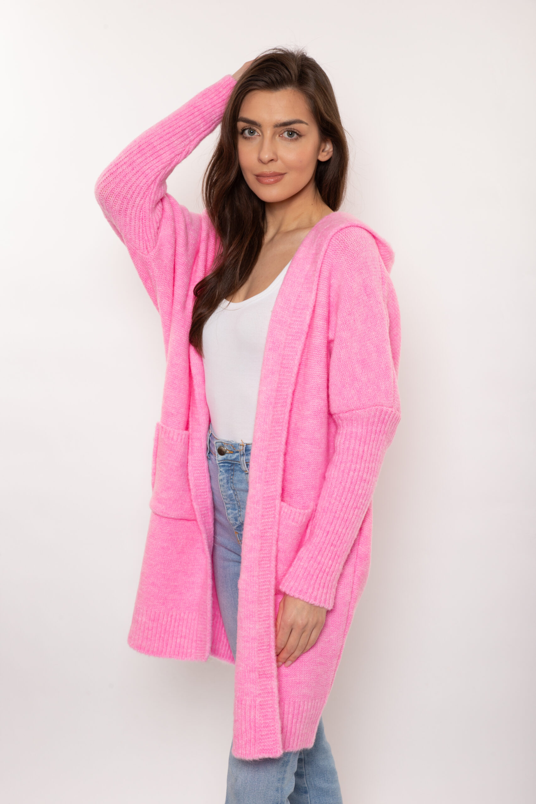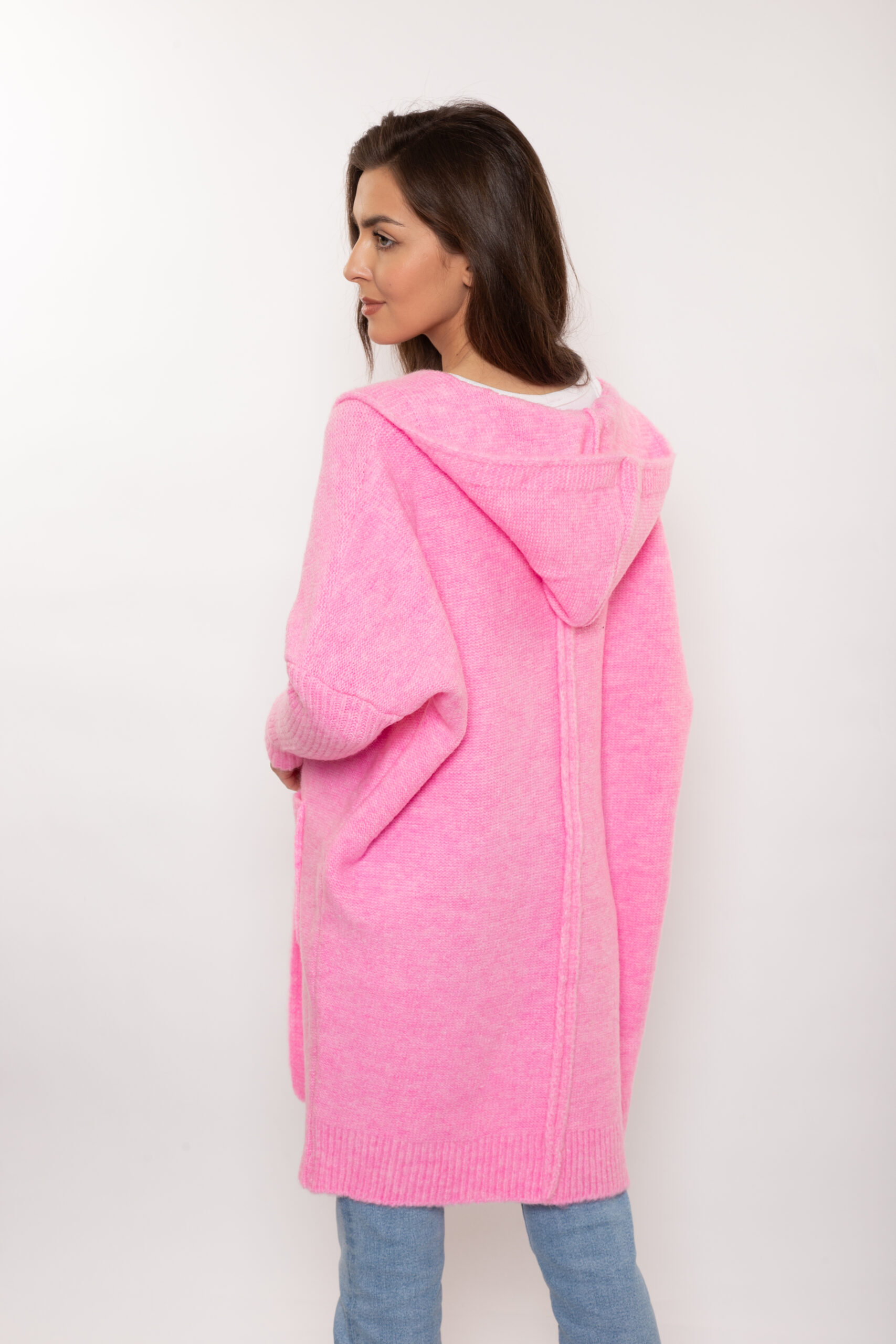 Dłuższy kardigan z kapturem i kieszeniami. Rękaw wykończony wysokim ściagaczem w prążek. Na plecach ozdobne przeszycie.
