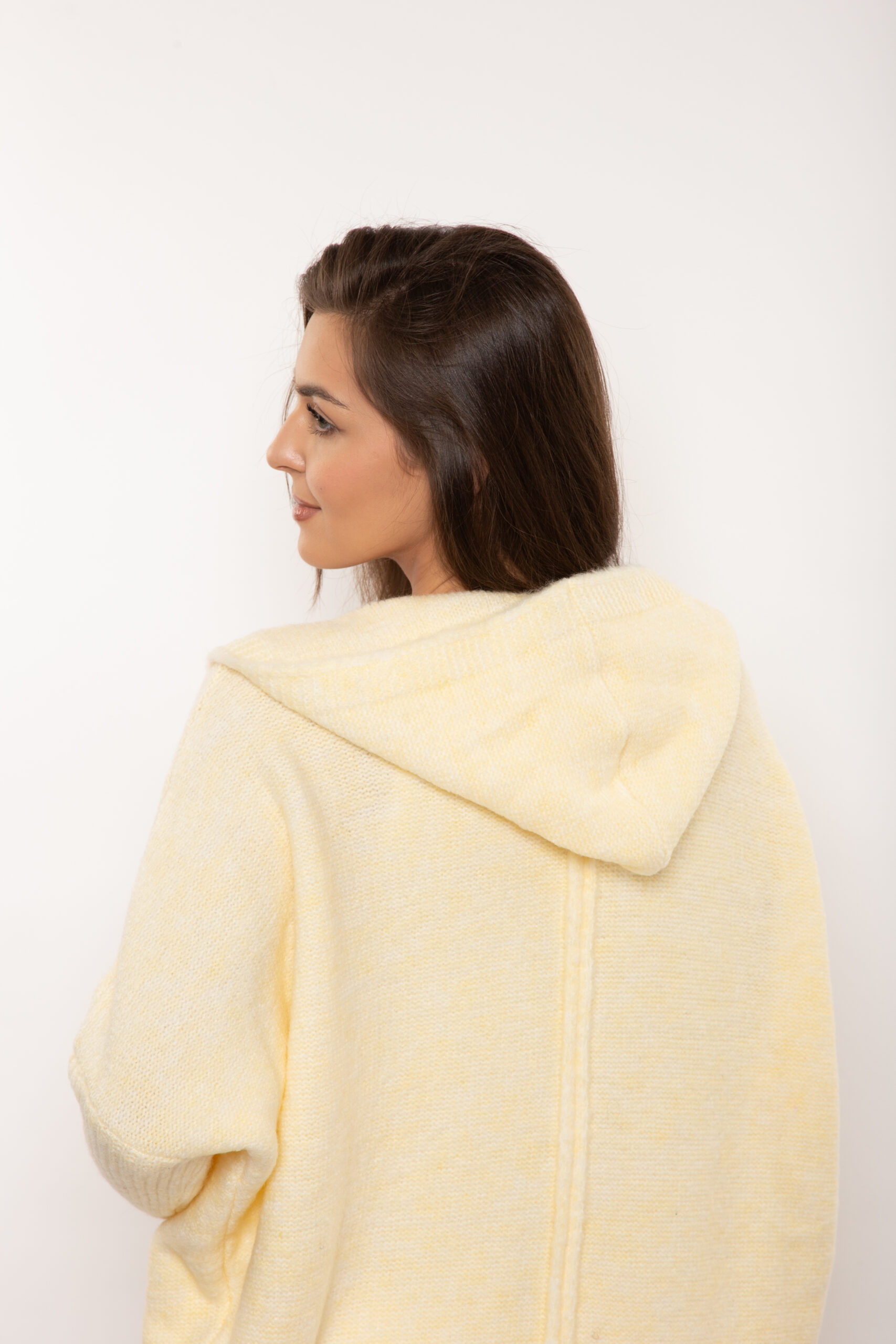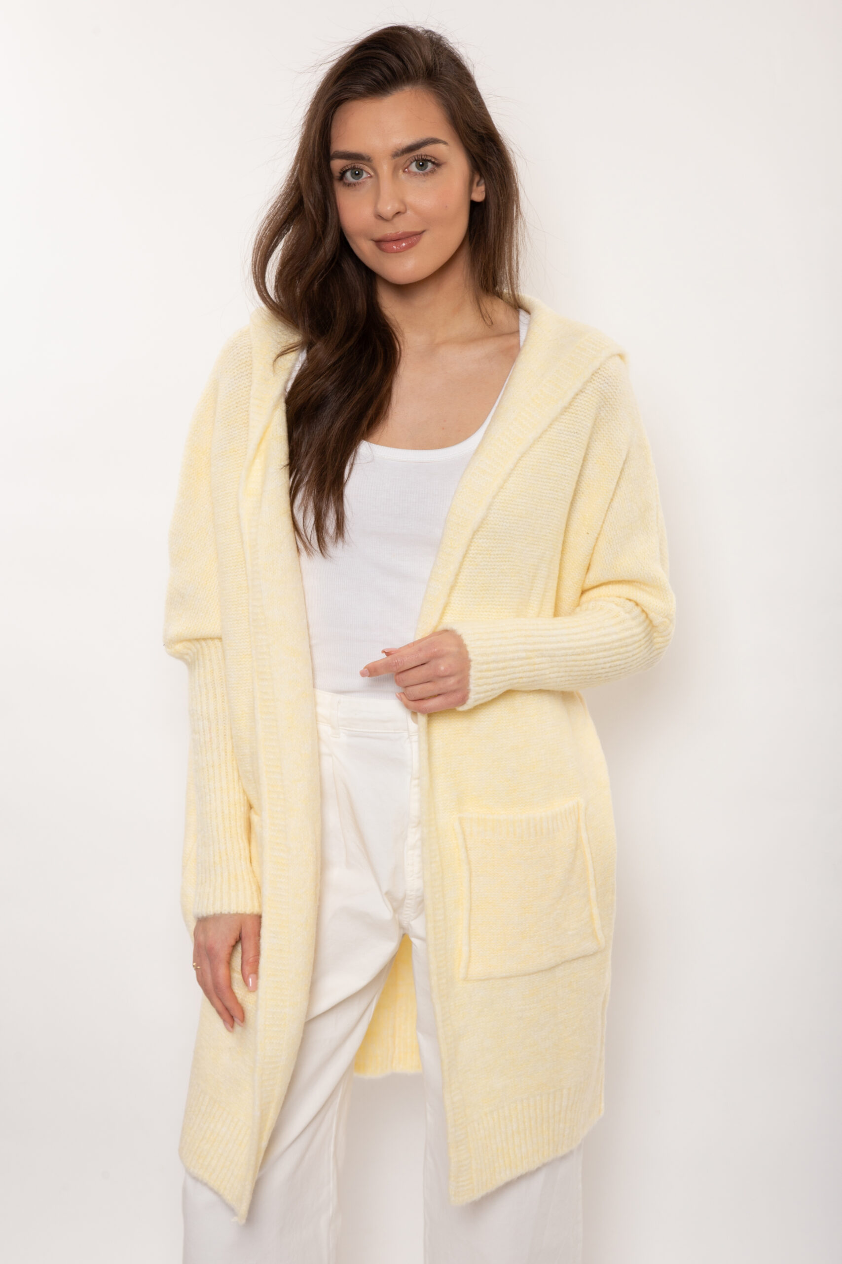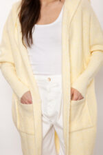 Dłuższy kardigan z kapturem i kieszeniami. Rękaw wykończony wysokim ściagaczem w prążek. Na plecach ozdobne przeszycie.