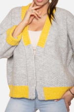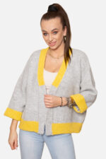 Kardigan rozpinany o ozdobnym splocie w serek, wykończony innym kolorem. Rękaw 3/4 z wywijanym mankietem.