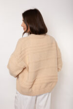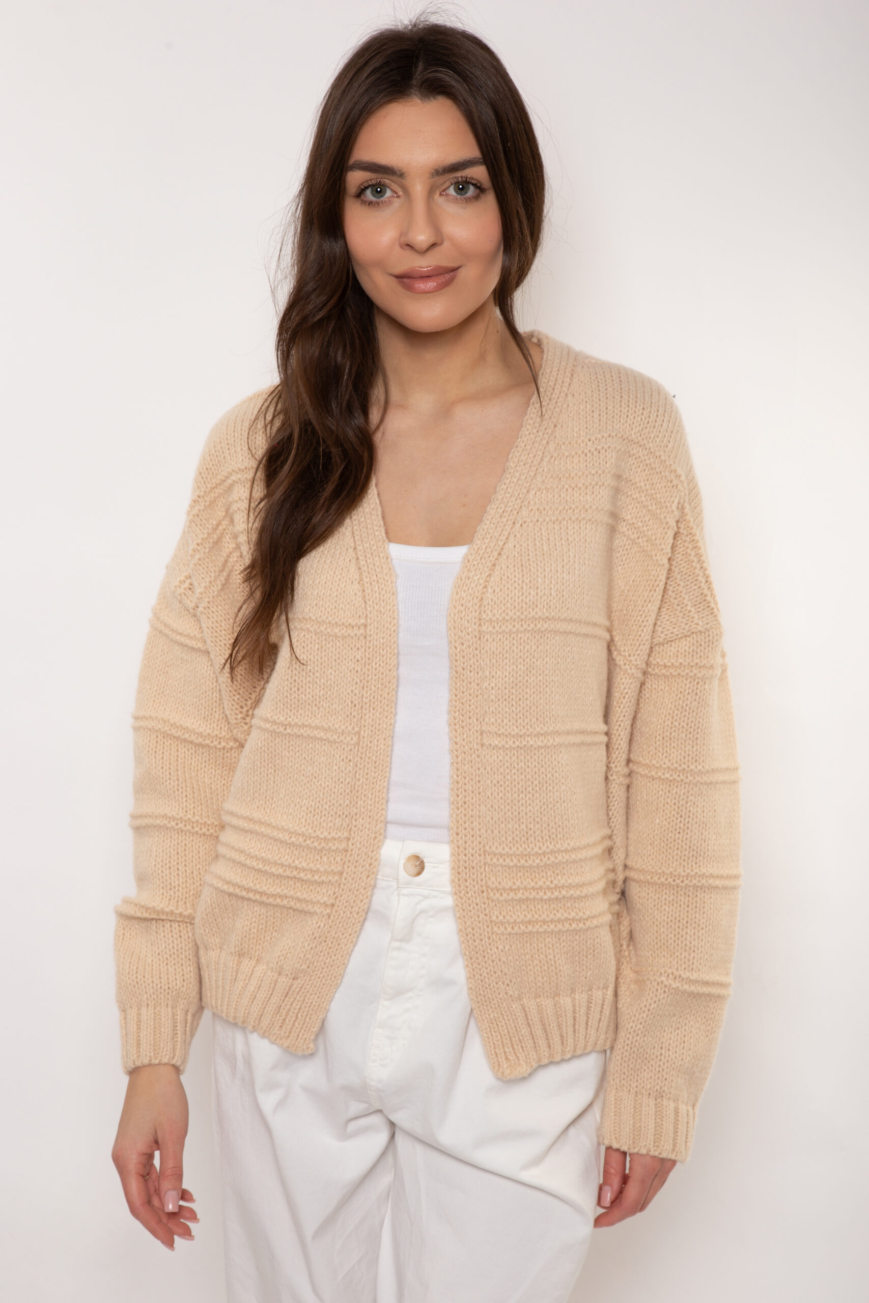 Kardigan rozpinany w serek z ozdobnym poprzecznym splotem w formie bomberki.