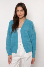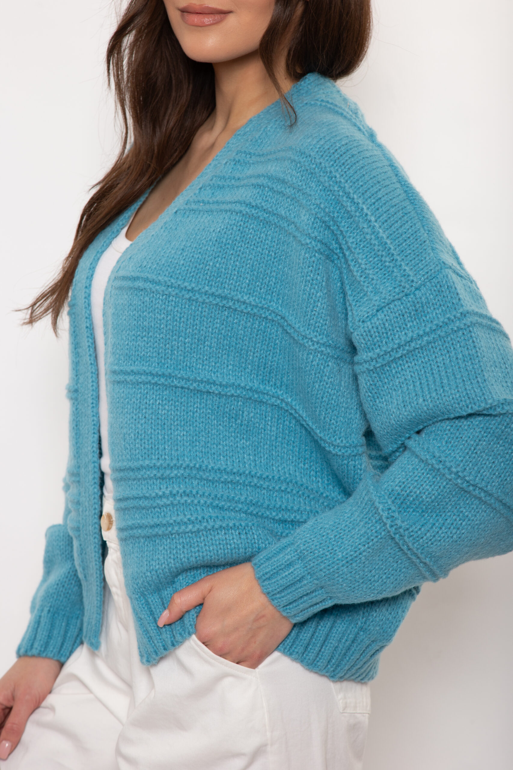Kardigan rozpinany w serek z ozdobnym poprzecznym splotem w formie bomberki.