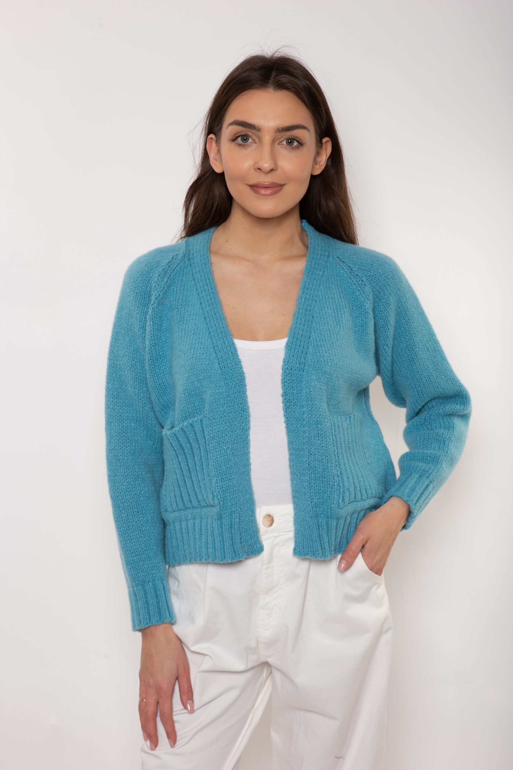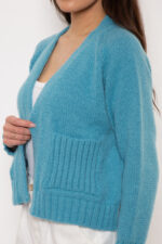 Krótki kardigan rozpinany w serek z ozdobnymi kieszeniami.