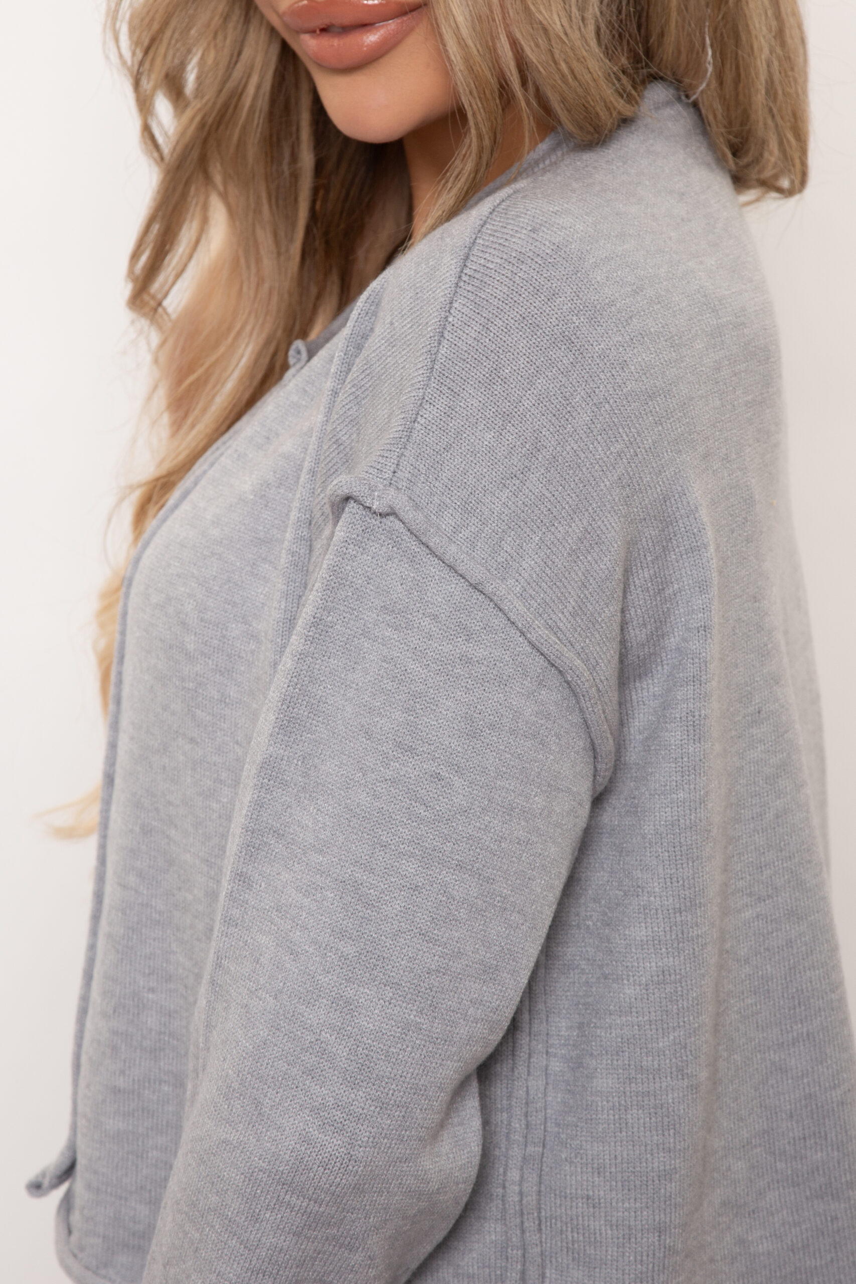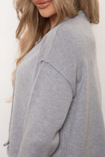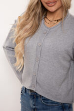 Krótki sweter oversize z elastycznej dzianiny. Zapinany na guziki, z ozdobnymi rulonami. Przód wykończony na półokrągło.