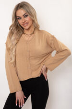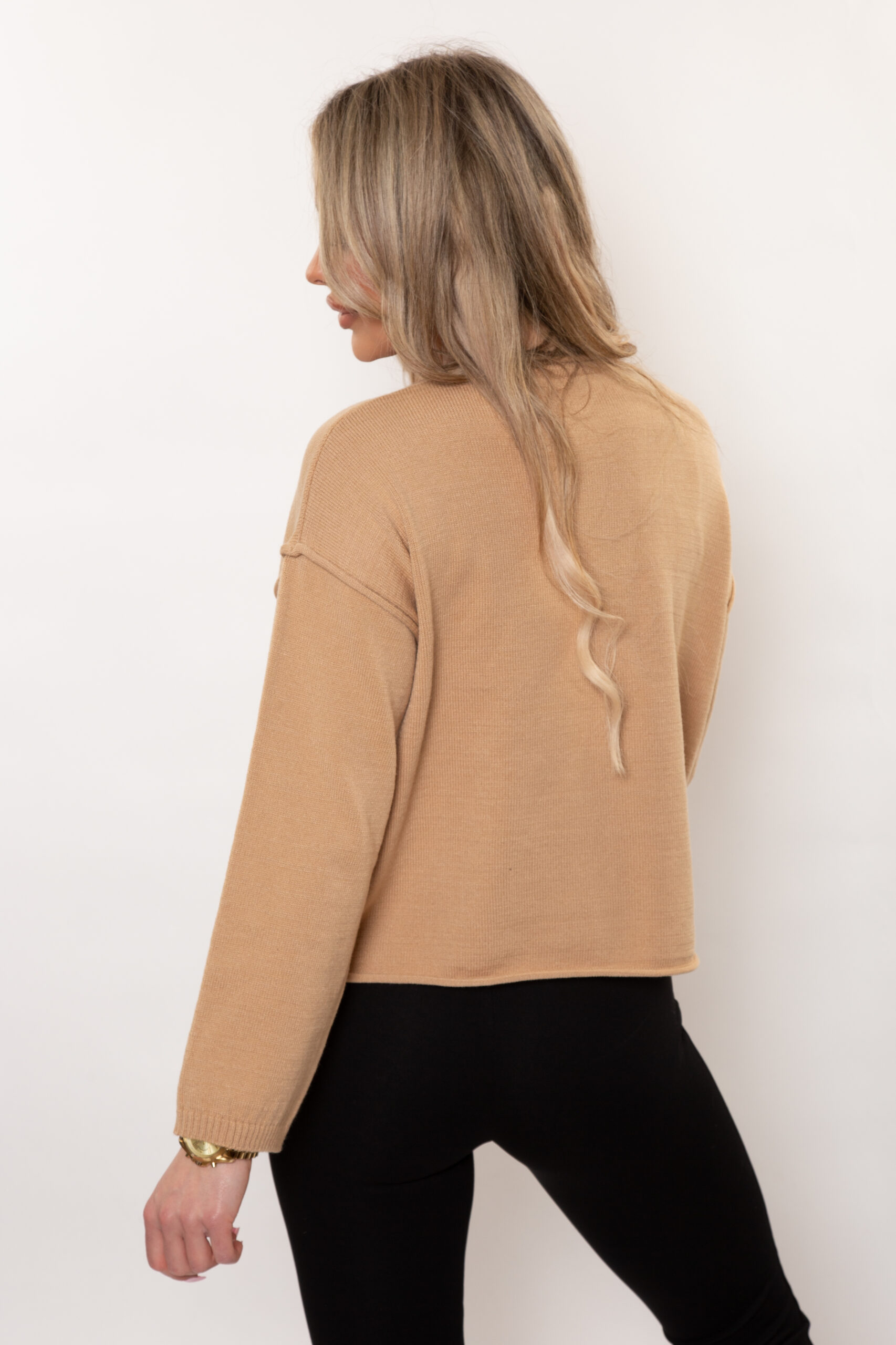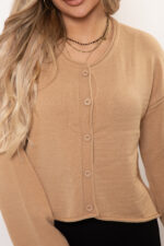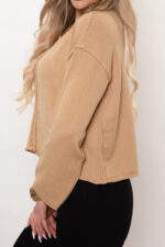 Krótki sweter oversize z elastycznej dzianiny. Zapinany na guziki, z ozdobnymi rulonami. Przód wykończony na półokrągło.