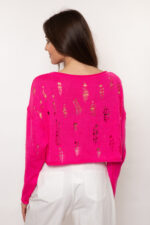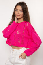 Krótki sweter z motywem mereszki. Wykończony rulonem pod szyją, na rękawach i na dole.