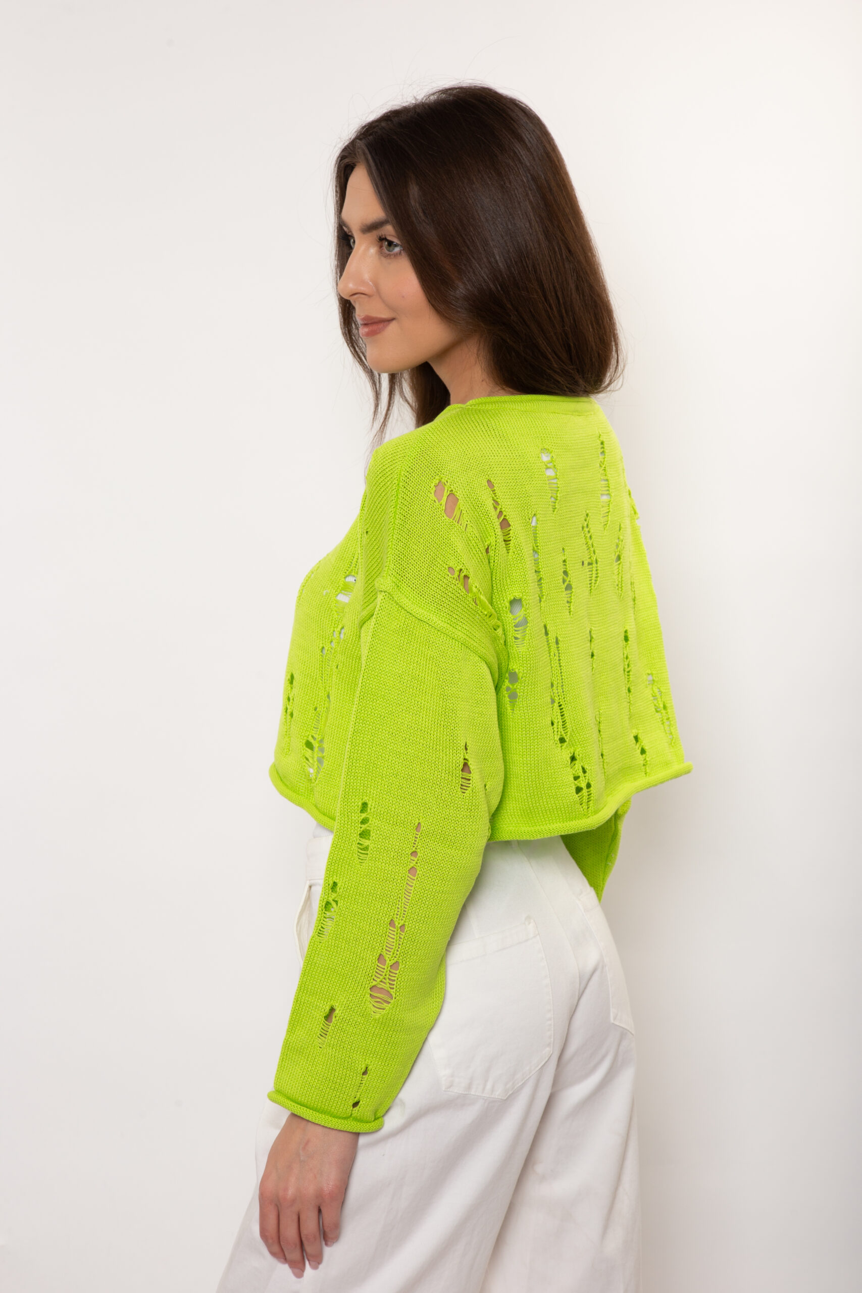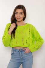 Krótki sweter z motywem mereszki. Wykończony rulonem pod szyją, na rękawach i na dole.