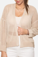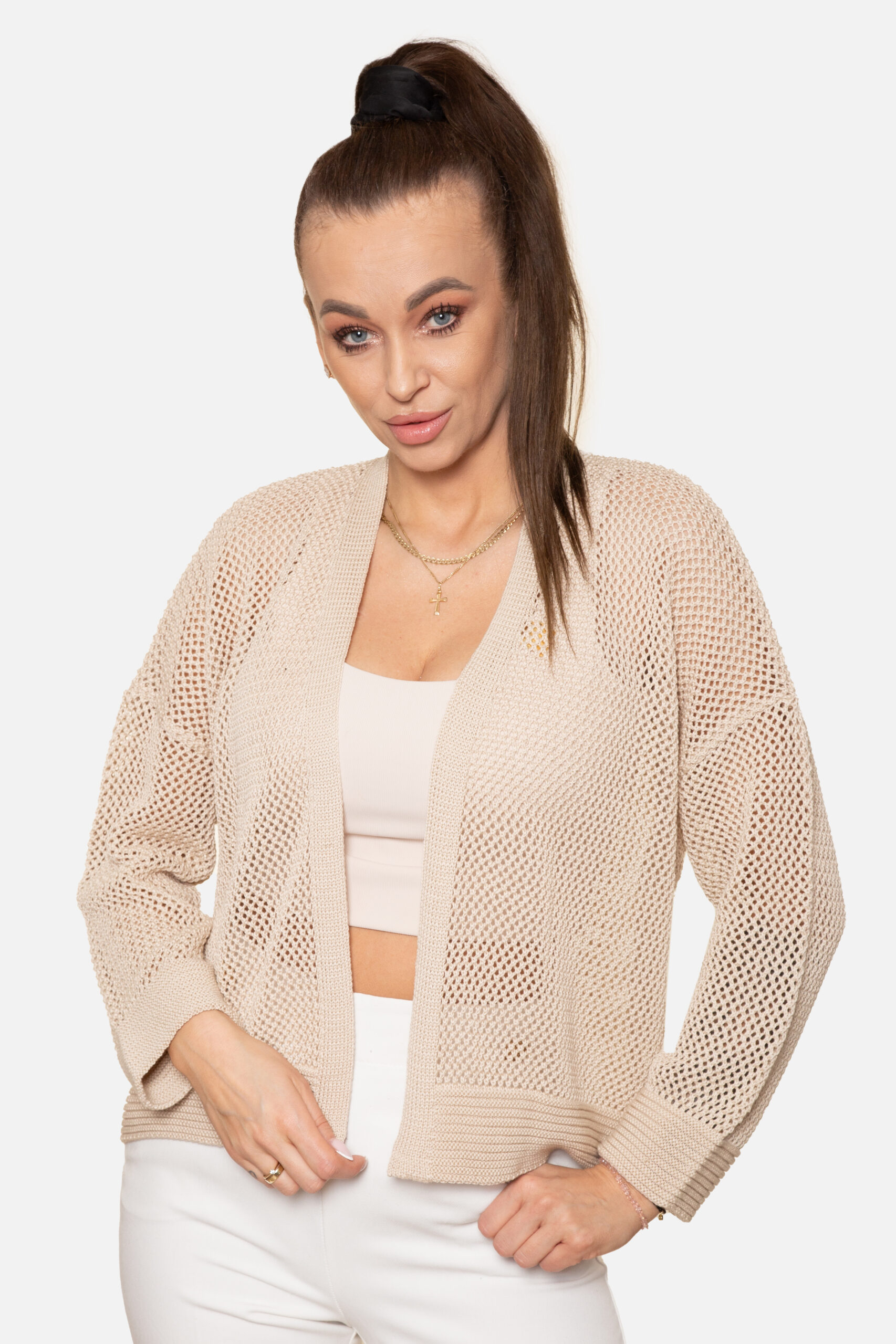 Sweter rozpinany w serek o drobnym ażurowym splocie. Mankiety i dół swetra wykonane ozdobnym ściągaczem.