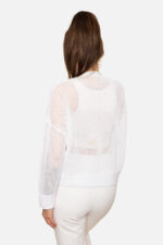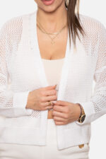 Sweter rozpinany w serek o drobnym ażurowym splocie. Mankiety i dół swetra wykonane ozdobnym ściągaczem.