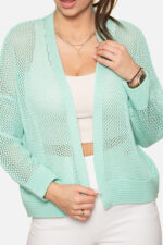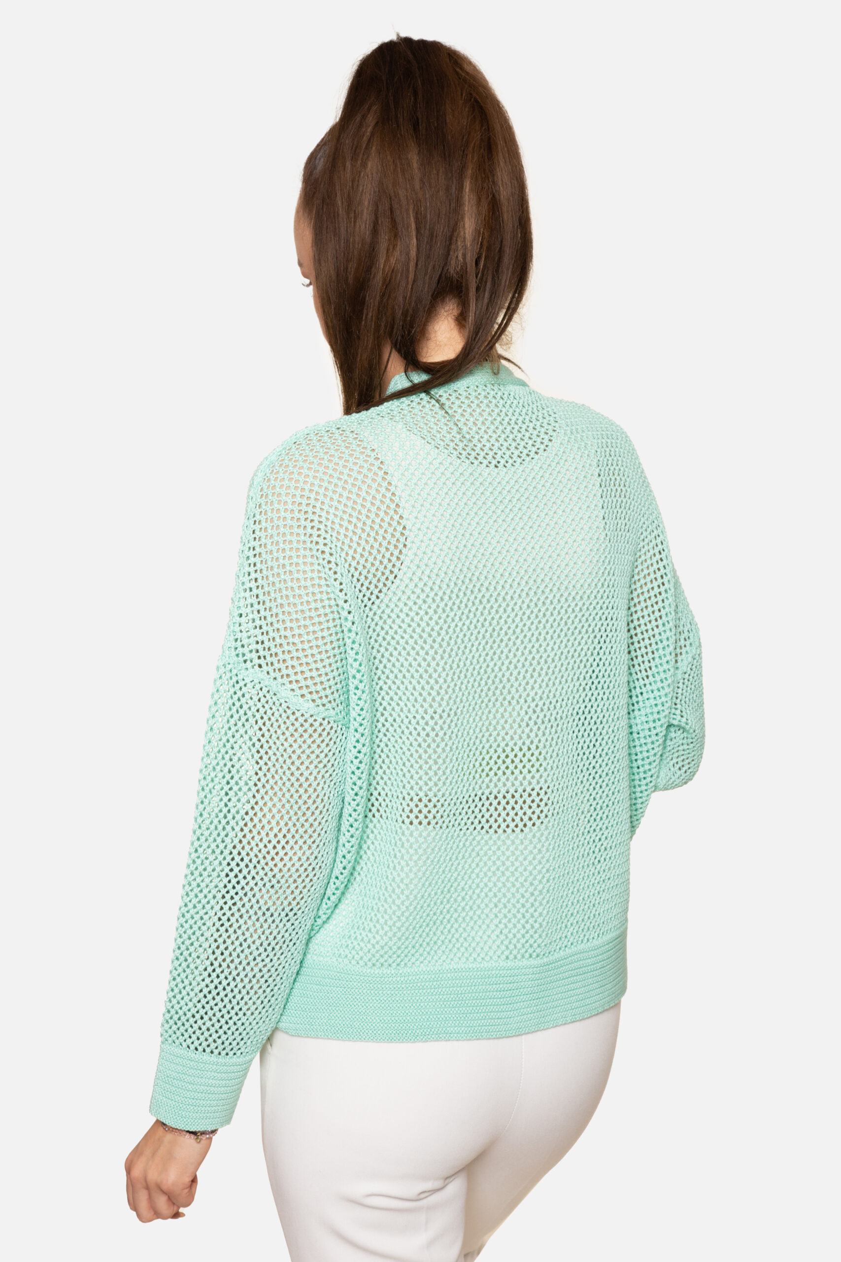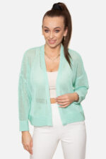 Sweter rozpinany w serek o drobnym ażurowym splocie. Mankiety i dół swetra wykonane ozdobnym ściągaczem.