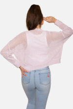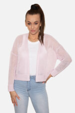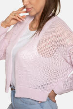 Sweter rozpinany w serek o drobnym ażurowym splocie. Mankiety i dół swetra wykonane ozdobnym ściągaczem.
