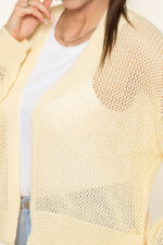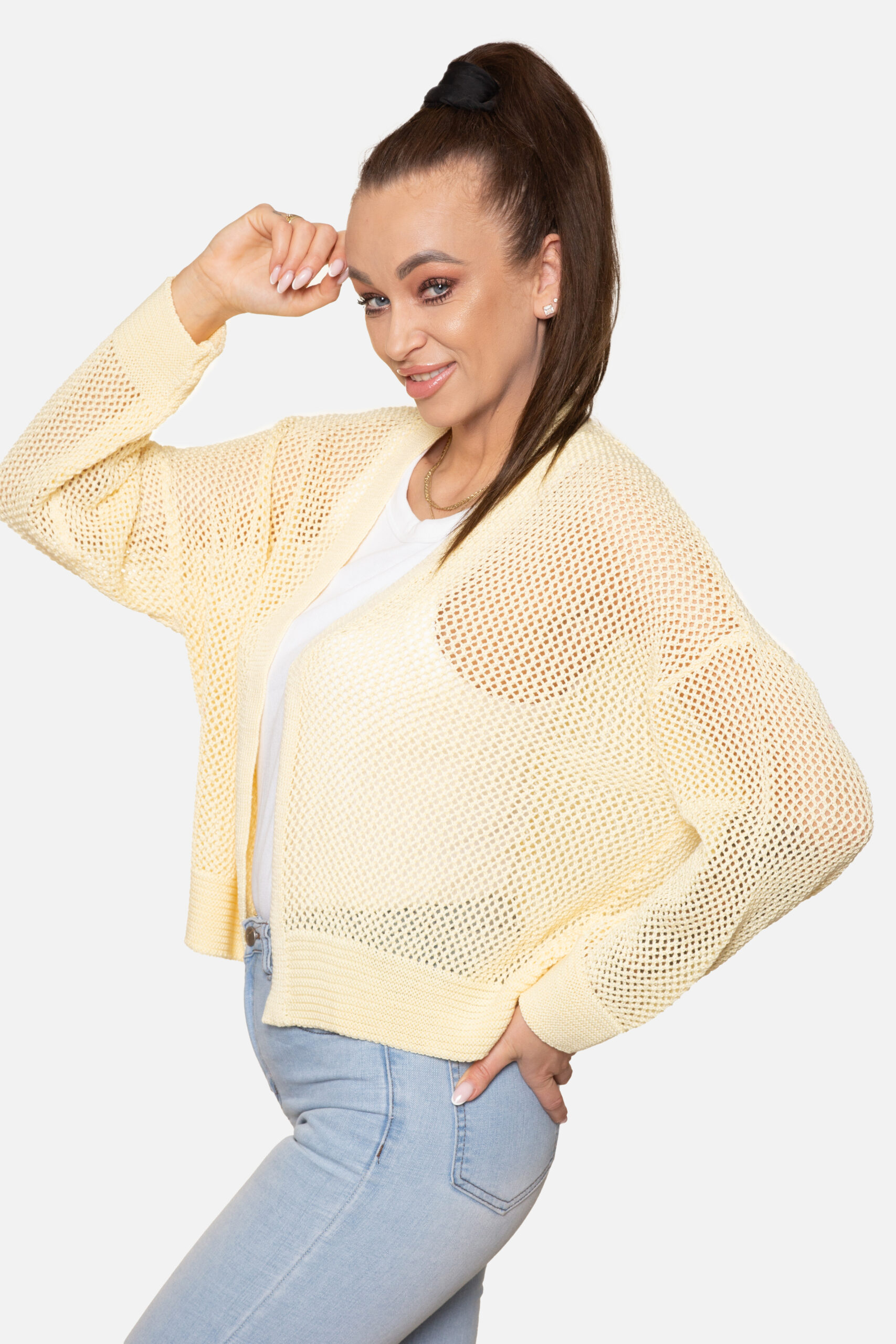 Sweter rozpinany w serek o drobnym ażurowym splocie. Mankiety i dół swetra wykonane ozdobnym ściągaczem.
