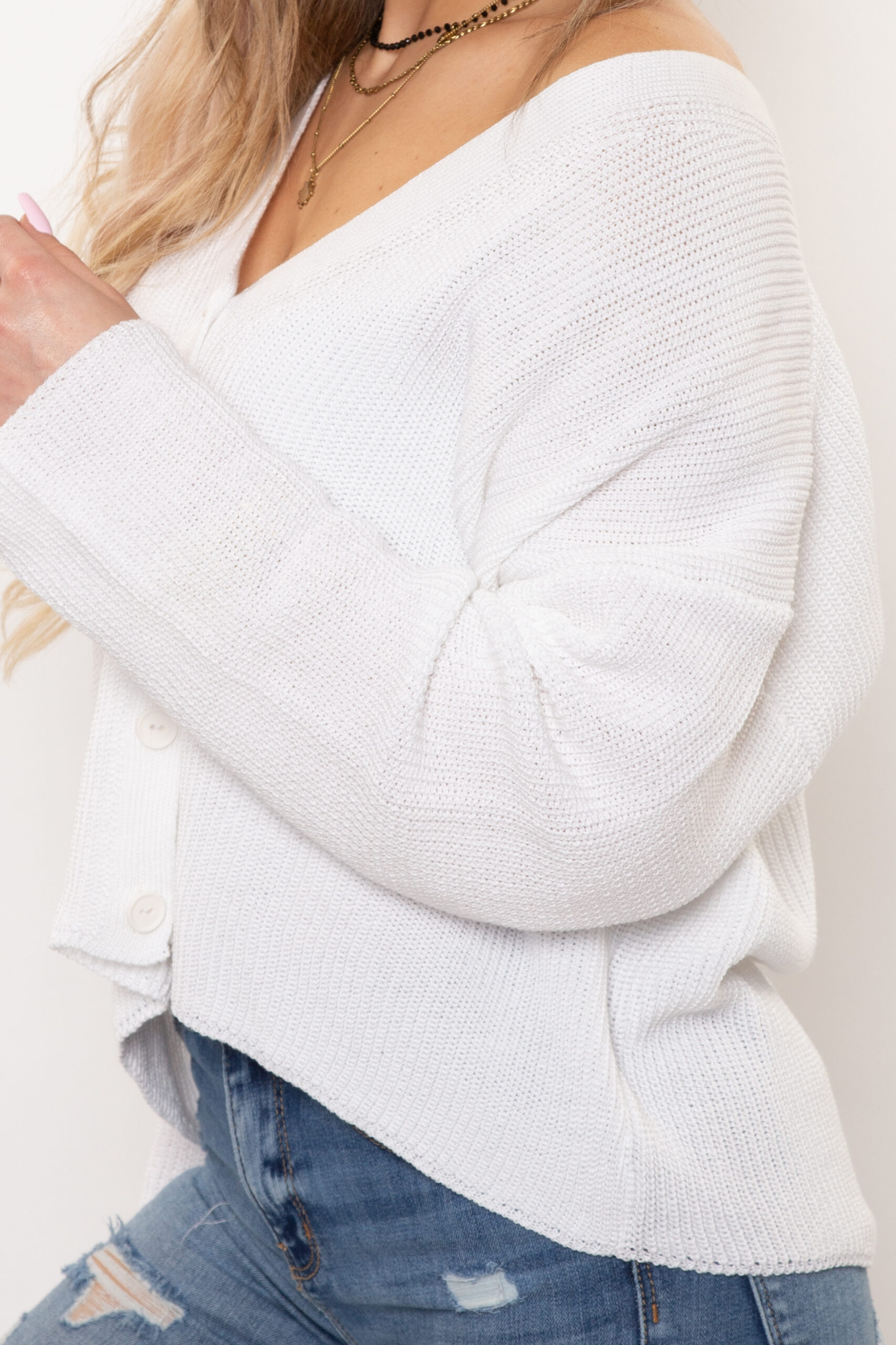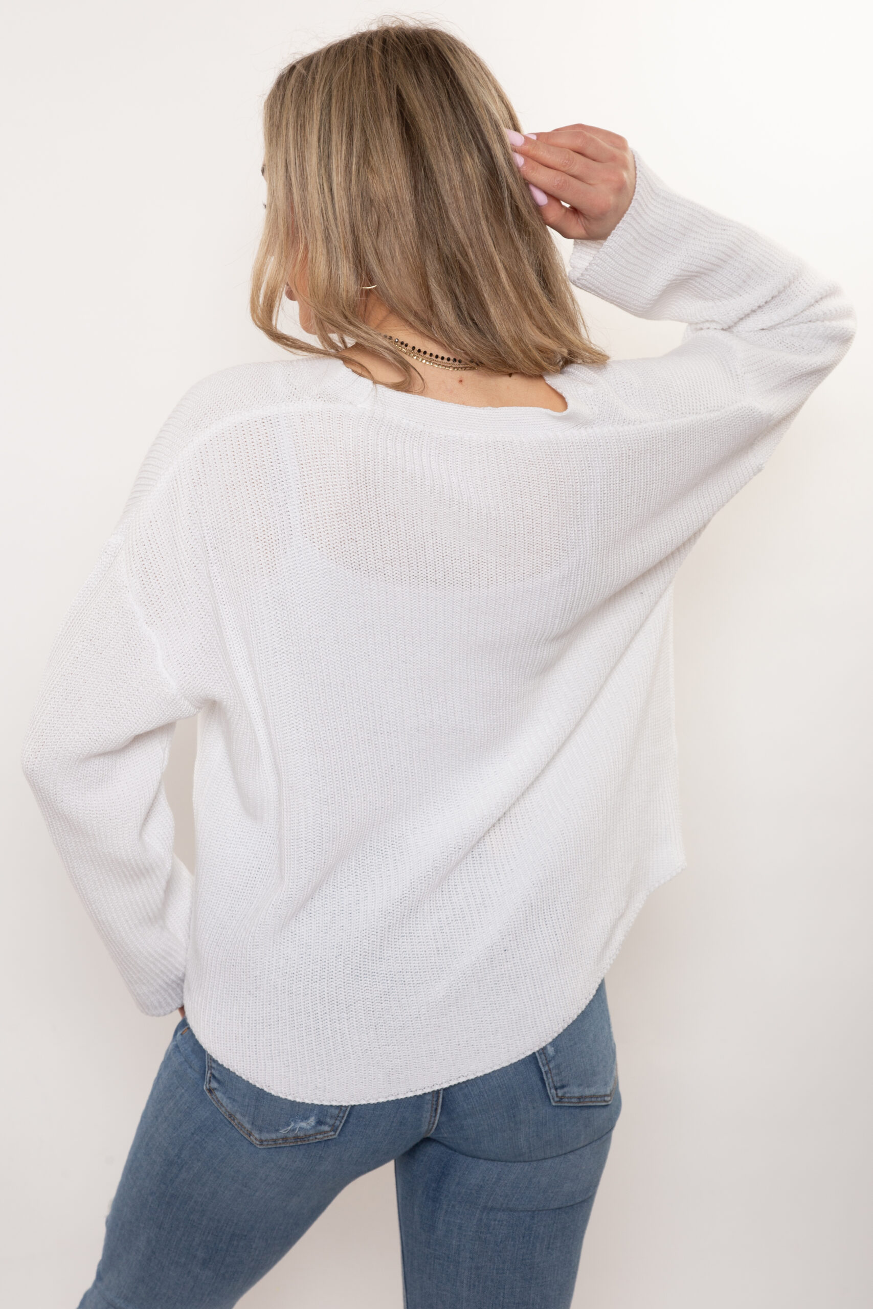Sweter w serek zapinany na guziki, przód krótszy, tył dłuższy. Wykończony na półokrągło.