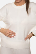 Sweter z dekoltem na półokrągło z motywem ściągacza na przodzie. Wykonany z elastycznej dzianiny.