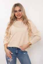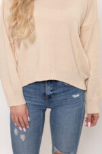 Sweter z elastycznej dzianiny z dołem na półokrągło, przód krótszy od tyłu.