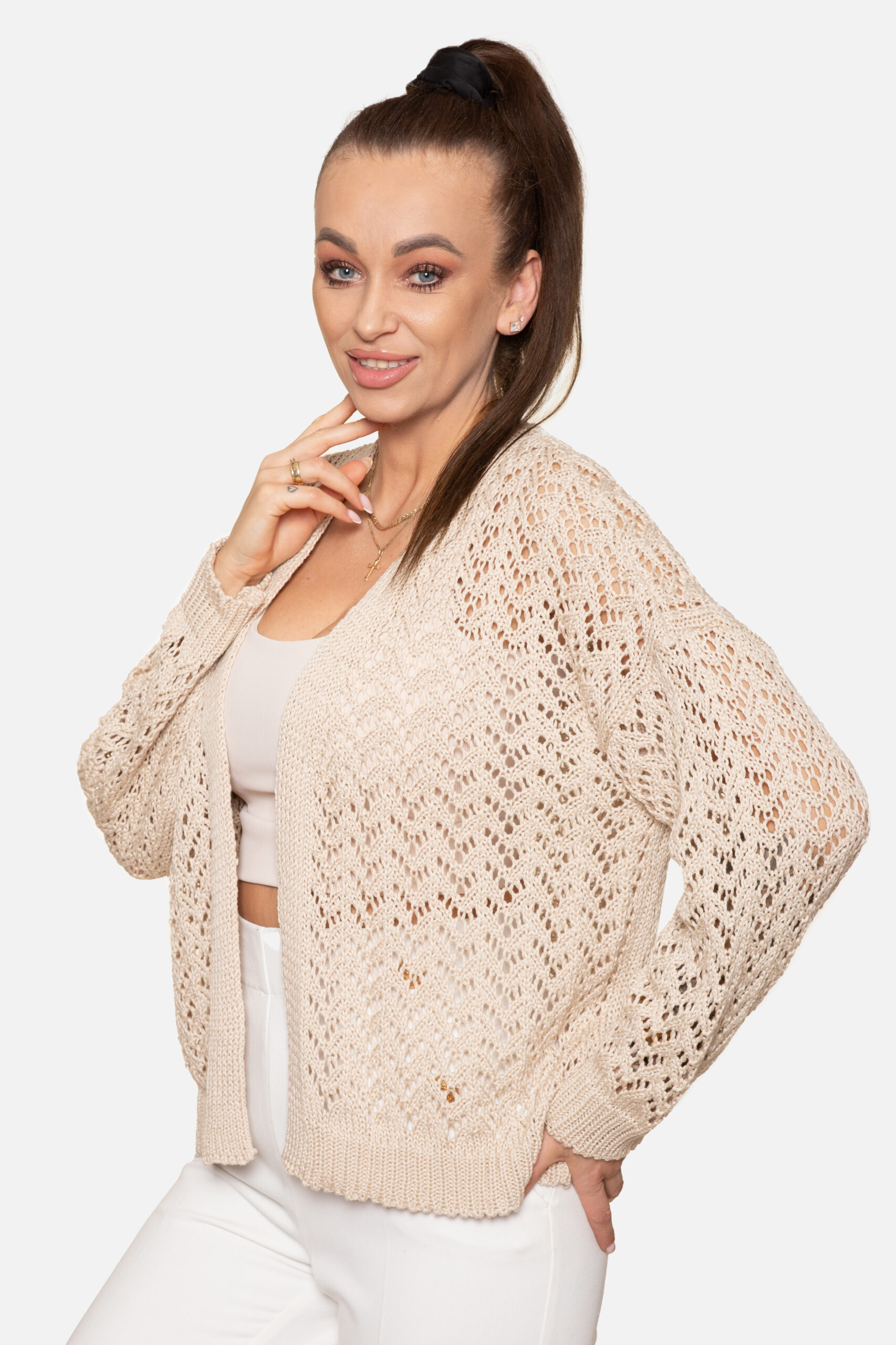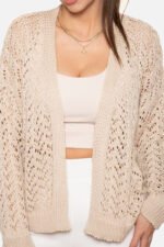 Sweter zapinany na guziki w serek o splocie ażurowo-warkoczowym, rękaw w formie bufki