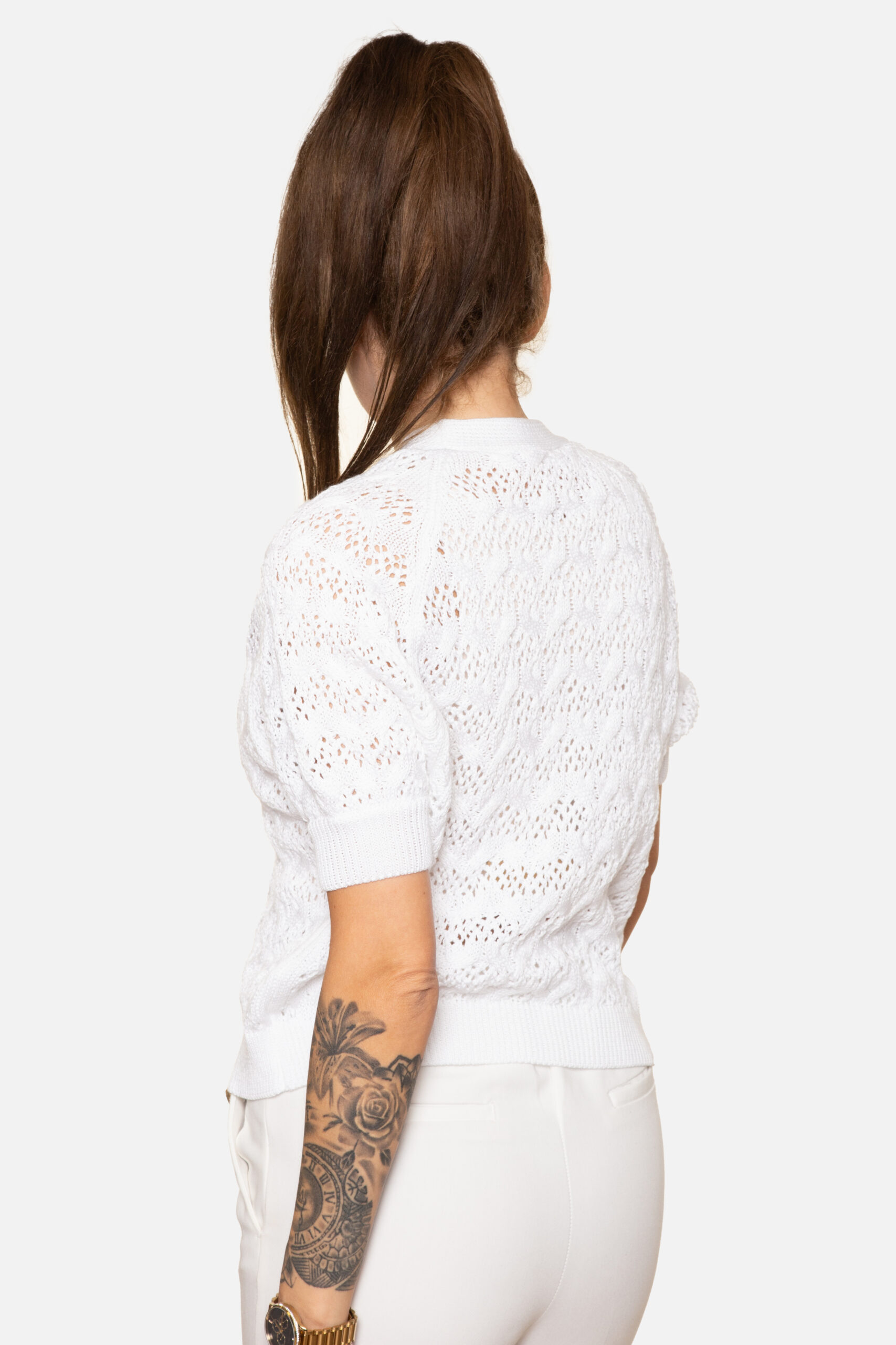 Sweter zapinany na guziki w serek o splocie ażurowo-warkoczowym. Rękaw w formie bufki.