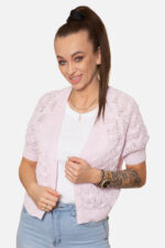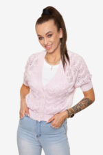 Sweter zapinany na guziki w serek o splocie ażurowo-warkoczowym. Rękaw w formie bufki.
